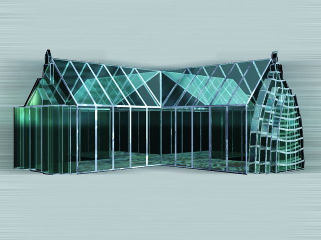 Two adjacent walls and the virtual environment, infrared wand, Wiimote, Mini Mac computer, three projectors.Interactive wall, on which the visitor adjusts the importance of search words with a infrared wand.